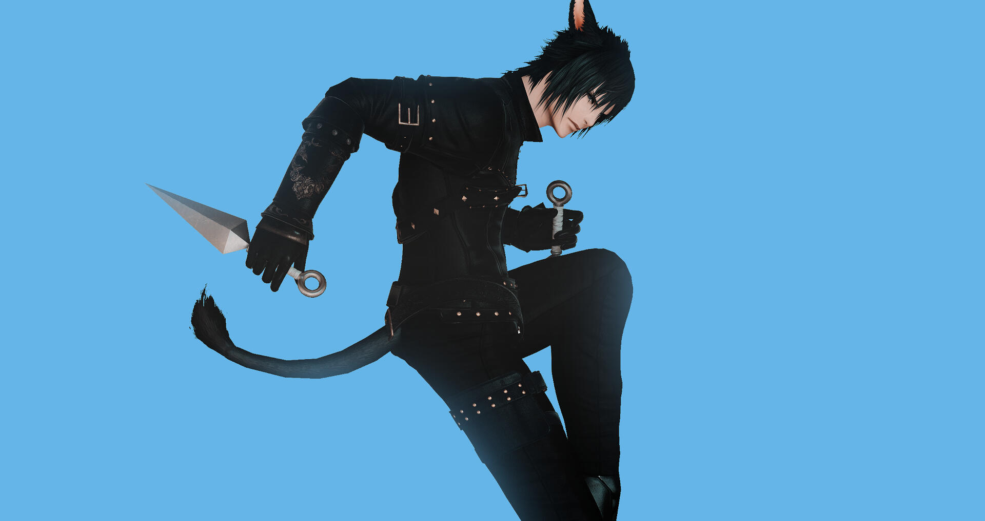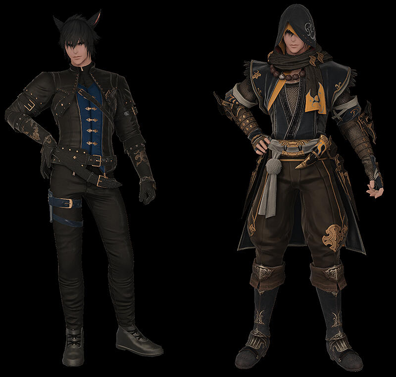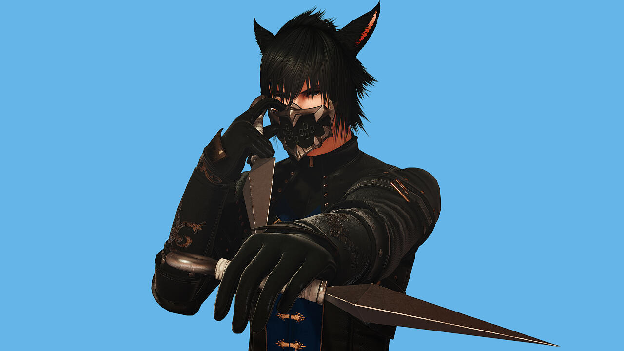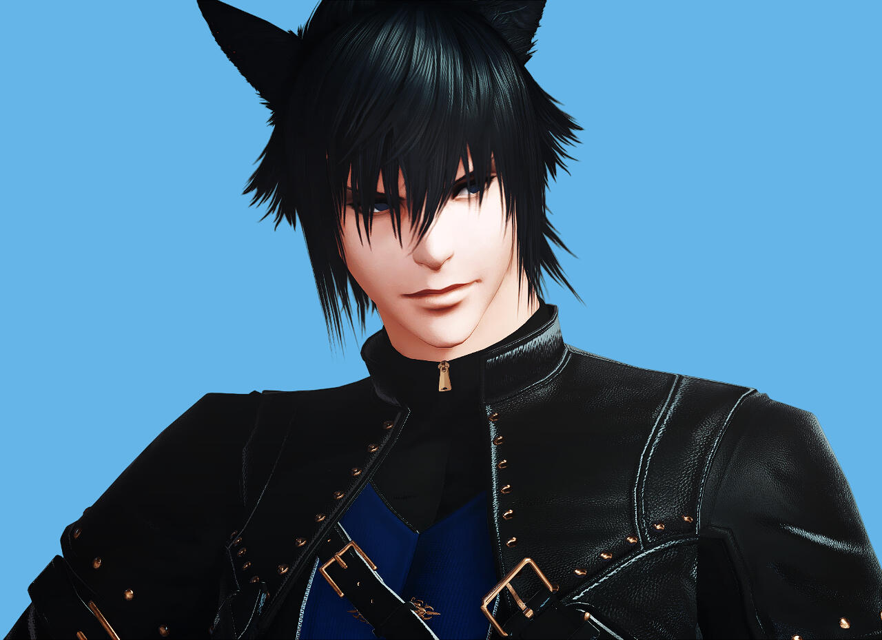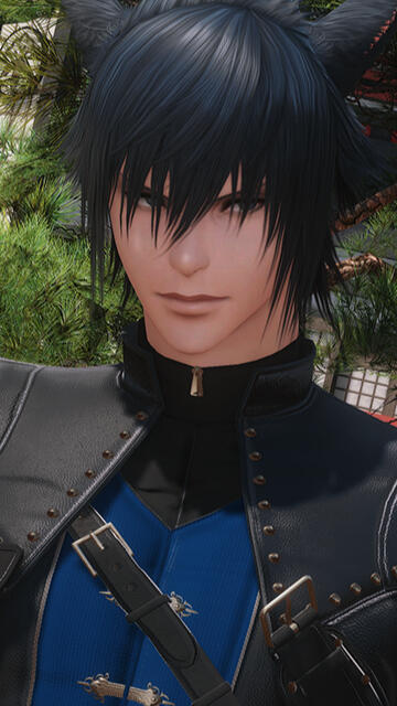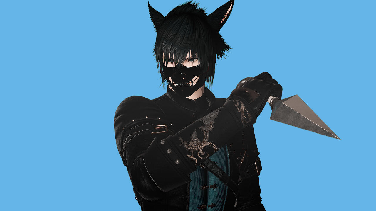 Yusei is a male Miqo'te with spiky hair and a delicate boyish appearance with deep blue eyes and bangs. His physique is lean but well-toned, suggesting extensive physical training despite his relatively narrow frame. He possesses sharp facial features, and a generally composed demeanor that often gives him a distant or contemplative expression. Like most Miqo'te, Yusei has prominent feline ears that rise from his hair, matching its deep black color.During his time in Danse Macabre, Yusei adopts a darker, more regal aesthetic. He wears a fitted black jacket layered over a deep blue vest secured with gold clasps. The jacket features reinforced shoulders and subtle ornamental stitching, combining practicality with a refined, almost aristocratic style.When dressed in his shinobi attire, Yusei's appearance becomes more concealed. He wears a long hooded coat layered over traditional shinobi garments, the fabric decorated with subtle gold embroidery and dark blue accents. The hood partially obscures his face which casts a shadow over his eyes and enhancing his mysterious presence.